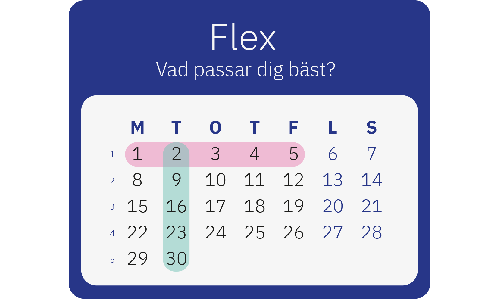 I Flex är kurser uppdelade till en dag i veckan under flera veckors tid. En vanlig femdagarskurs genomförs då under ett antal veckor istället för en vecka.